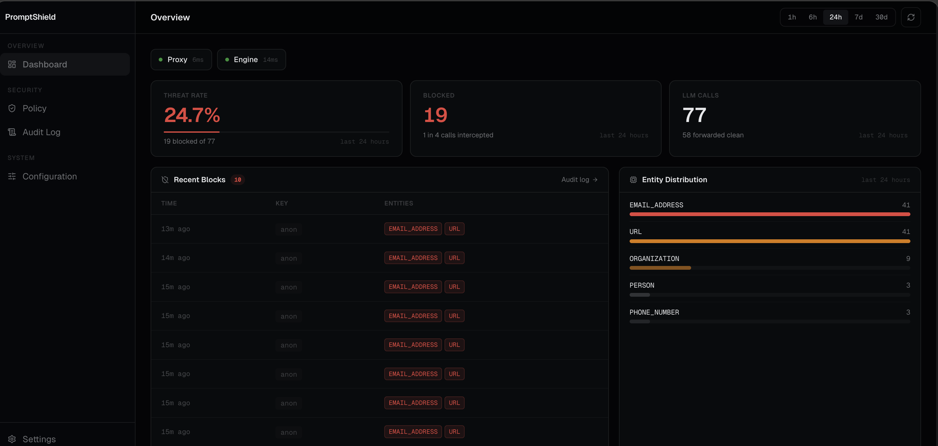 The PromptShield dashboard is a self-hosted web app for managing the proxy and engine without touching config files directly.